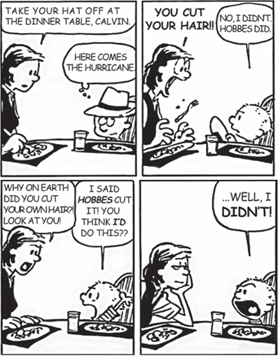 Nos quadrinhos de Calvin and Hobbes, Calvin costuma usar comparações exageradas com fenômenos da natureza para expressar reações intensas dos adultos. Ao mencionar um “hurricane” (furacão), ele faz uma metáfora para o comportamento explosivo da mãe ao ver o resultado do corte de cabelo que ele mesmo fez.