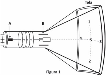 A Figura 1 apresenta o esquema de um tubo de imagem em que um filamento, na posição A, libera elétrons por efeito termiônico. Esses elétrons formam um feixe estreito, que é acelerado por campos elétricos em direção à parte interna da tela. Nesse caminho, o feixe de elétrons passa por outro campo elétrico, na região B, atingindo, em seguida, a parte interna da tela do tubo, a qual é recoberta por um material que emite luz ao receber o impacto dos elétrons.