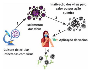 A produção de vacinas exige uma sequência de procedimentos, além do cumprimento estrito de verificações de segurança. No esquema, estão demonstradas as etapas básicas realizadas para a fabricação de uma vacina utilizando a tecnologia tradicional e o efeito dela no organismo.