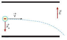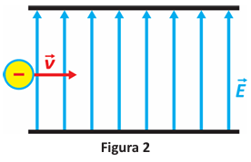Como a partícula que penetra o campo elétrico é negativa, a força elétrica e o campo elétrico têm sentidos opostos.