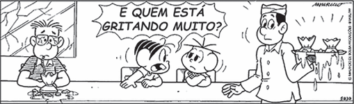 A tirinha ilustra um processo físico em que uma onda sonora, produzida pela Mônica, causa a quebra das taças de cristal. O fenômeno ondulatório que provoca a quebra das taças só é possível em razão de uma característica da voz produzida pela Mônica naquele momento, que, diferentemente do que sugere a tirinha, não está relacionada à sua intensidade.