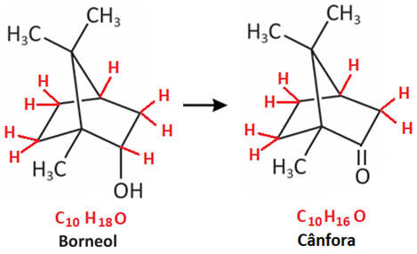 A oxidação do álcool secundário Borneol produz a cetona cânfora, com fórmula molecular [tex]C_{10}H_{16}O[tex], com mostra a equação a seguir: