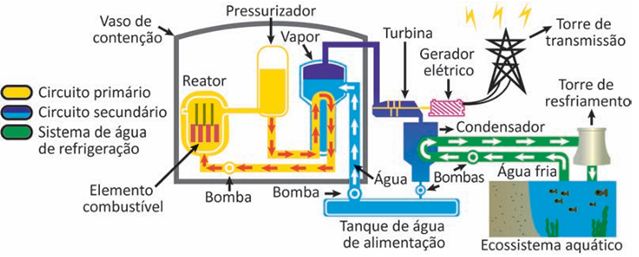 As usinas termonucleares são aquelas que produzem energia elétrica a partir da geração de energia térmica proveniente das reações nucleares. Normalmente, essas usinas funcionam por meio de dois circuitos, denominados circuito primário (vaso de pressão, pressurizador e bomba) e circuito secundário (gerador de vapor, turbina, condensador, tanque de alimentação e bombas), além de um sistema de água de refrigeração, formado por uma bomba ligada a uma fonte hídrica natural.