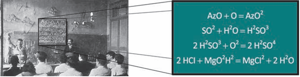 No início do século XX, as fórmulas das substâncias eram representadas de modo diferente do atual. A figura apresenta uma fotografia bem antiga (1909) que registra uma aula de química ministrada em um colégio em Santos (SP). Um olhar mais atento permite identificar como os compostos químicos eram representados.