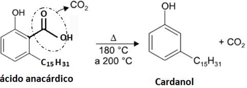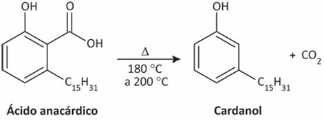 O fruto do cajueiro é um aquênio repleto de um líquido escuro, quase preto, cáustico e inflamável. Esse líquido da casca da castanha do caju (LCC) representa aproximadamente 25% da massa da castanha e é um subproduto de agronegócio do caju. Quando submetido a altas temperaturas, o ácido anacárdico presente no LCC é convertido a cardanol, que recebe a denominação de LCC técnico, conforme o esquema: