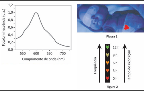 O gráfico apresenta o espectro de fotoluminescência do sensor em função do comprimento de onda da luz emitida no início do tratamento, quando o sensor, colado na fralda do bebê (Figura 1), luminesce na região do vermelho-laranja (∼600 nm). A Figura 2 apresenta a evolução da coloração do sensor, mostrando que a frequência da luz emitida por ele aumenta em função do tempo de exposição à luz azul.