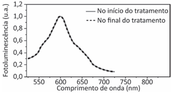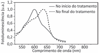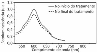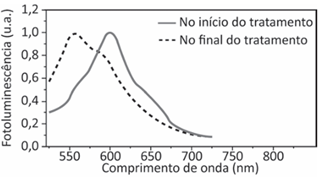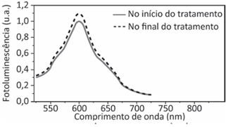 Os espectros de fotoluminescência do sensor no início e no final do tratamento estão esboçados no gráfico: