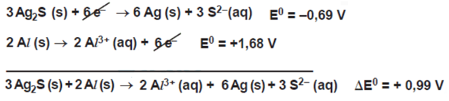 (II) Cálculo da diferença de potencial padrão da reação do clareamento do objeto de prata; multiplicando a primeira reação por 3 e invertendo e multiplicando por 2 a terceira reação, temos: