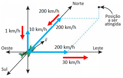 Segundo o princípio da independência dos movimentos, de Galileu, sempre que a velocidade resultante de um corpo puder ser decomposta em duas ou mais componentes perpendiculares entre si, cada um desses movimentos poderá ser analisado separadamente como se os outros não existissem. Esse princípio é muito útil para a simplificação de alguns problemas reais, em três dimensões. Considere um avião que, ao decolar, é instruído pela torre a atingir, em 6 minutos, uma posição de 20 km a Leste, 20 km a Norte e 1 km de altitude em relação ao ponto de decolagem, conforme a figura (fora de escala). No entanto, no instante da decolagem, começa a soprar um vento cujo vetor velocidade tem componentes 30 km/h para Leste, 20 km/h para Sul e 1 km/h de cima para baixo.