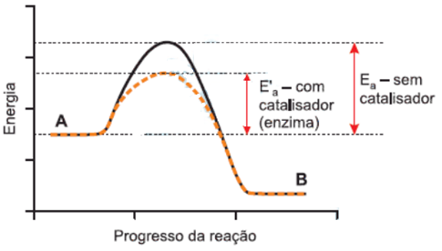Nos processos de transformação e reciclagem de recursos naturais, as velocidades das reações químicas são estudadas pela cinética química. Uma reação A → B é realizada na presença e na ausência de uma enzima, com todas as demais condições permanecendo inalteradas. Considere que, no gráfico da variação de energia ao longo dessa reação, a linha contínua representa o avanço da reação na ausência da enzima, e a linha pontilhada, na presença da enzima.