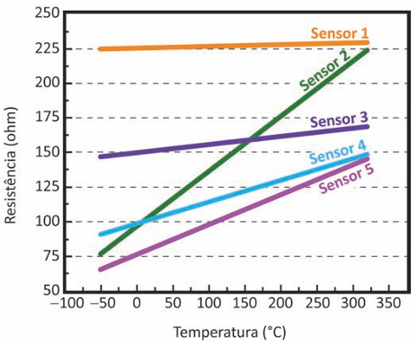 A resistência de um fio de platina pode ser usada para medir temperaturas entre 0 °C e 100 °C e já foi utilizada como referência para a escala internacional de temperatura. Para um sensor feito de platina, a relação entre a resistência e a temperatura pode ser descrita por uma equação do tipo R(T) = A + BT, em que T é a temperatura e A e B são constantes. O gráfico apresenta a dependência da resistência em função da temperatura para cinco diferentes sensores.