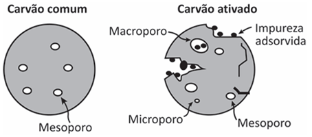A filtração em carvão é uma das mais antigas formas de purificação de água. O carvão ativado, diferentemente do carvão comum, é útil para ser empregado na remoção de material orgânico, cloro e outros contaminantes. Essa capacidade decorre de suas propriedades de adsorção. A origem do material utilizado para produzir o carvão ativado pode influenciar sua porosidade e, consequentemente, interferir na capacidade do material de remover impurezas. Na figura, é ilustrada esquematicamente a diferença entre as estruturas físicas do carvão comum e do carvão ativado.