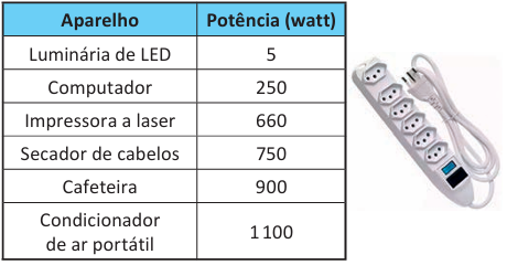 Réguas elétricas são dispositivos que permitem a ligação segura e simultânea de dois ou mais aparelhos eletroeletrônicos à rede elétrica. Uma estudante comprou uma régua com seis tomadas, conforme a figura. Essa régua suporta uma intensidade máxima de corrente elétrica igual a 20 A. Acima desse valor, o fusível de segurança da régua se rompe, inutilizando-a até que um novo fusível seja instalado. Considere as potências nominais de alguns aparelhos eletroeletrônicos apresentadas no quadro.