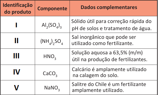 O plantio do feijão requer solos que apresentem fertilidade de média a alta, pH entre 5,8 e 6,2, altos teores de cálcio, magnésio, nitrogênio, fósforo e enxofre e baixa concentração de alumínio e manganês. Um agricultor necessita iniciar a plantação de feijão em sua lavoura, que se encontra com a superfície clara e esbranquiçada, característica de solos alcalinos. Para obter um produto que possa ser aplicado diretamente ao solo, o agricultor procurou uma loja especializada, deparando-se com os seguintes produtos: