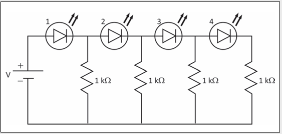 🔽 A tensão diminui progressivamente do LED 1 para o LED 4.