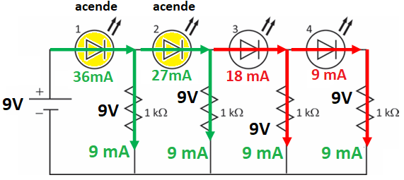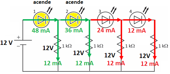 LEDs 3 e 4: tensão insuficiente → não acendem