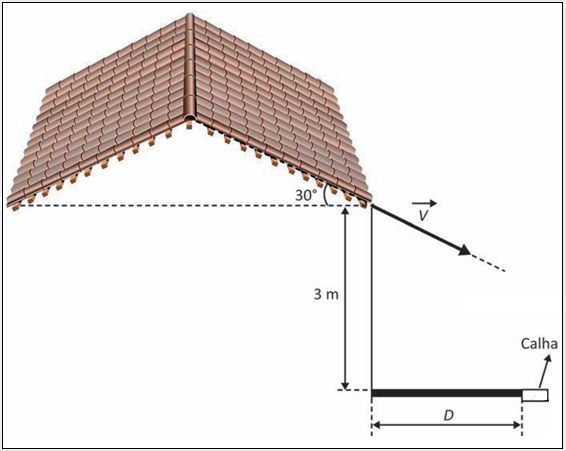 Para coletar as águas das chuvas, é utilizada uma calha, que está no solo a uma distância horizontal D da base do telhado. O telhado apresenta inclinação de 30°. Como sua base se encontra a uma altura de 3 metros em relação ao solo, o tempo de queda das águas é de 0,6 segundo. Com isso, somente as águas das chuvas mais fortes, que escoam pelo telhado a uma velocidade de módulo [tex]V = 4\ m/s[tex], são coletadas diretamente pela calha.