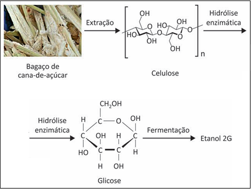Há um grande esforço científico no desenvolvimento de novos processos para o aproveitamento de resíduos lignocelulósicos, como o bagaço de cana-de-açúcar, para produção de etanol de segunda geração (2G). Apesar de já existirem tecnologias disponíveis, a maioria apresenta limitações técnicas ou econômicas. Nesse sentido, um dos principais desafios que envolvem a produção de etanol celulósico é disponibilizar monossacarídeos fermentáveis das moléculas poliméricas, conforme a ilustração.