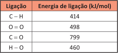 O conteúdo de um cilindro de gás natural veicular explodiu, liberando um volume de 15 m³ de gás, que entrou em combustão. Apesar do risco de explosão, o gás natural veicular (GNV) é um combustível bastante eficiente em termos econômicos. Apresenta densidade de 0,8 kg/m³ e seu componente principal é o metano ([tex]CH_{4}[tex]), de massa molar igual a 16 g/mol, numa concentração de 90%. É possível avaliar a energia liberada na explosão a partir das energias de ligação dos átomos envolvidos, descritas no quadro.